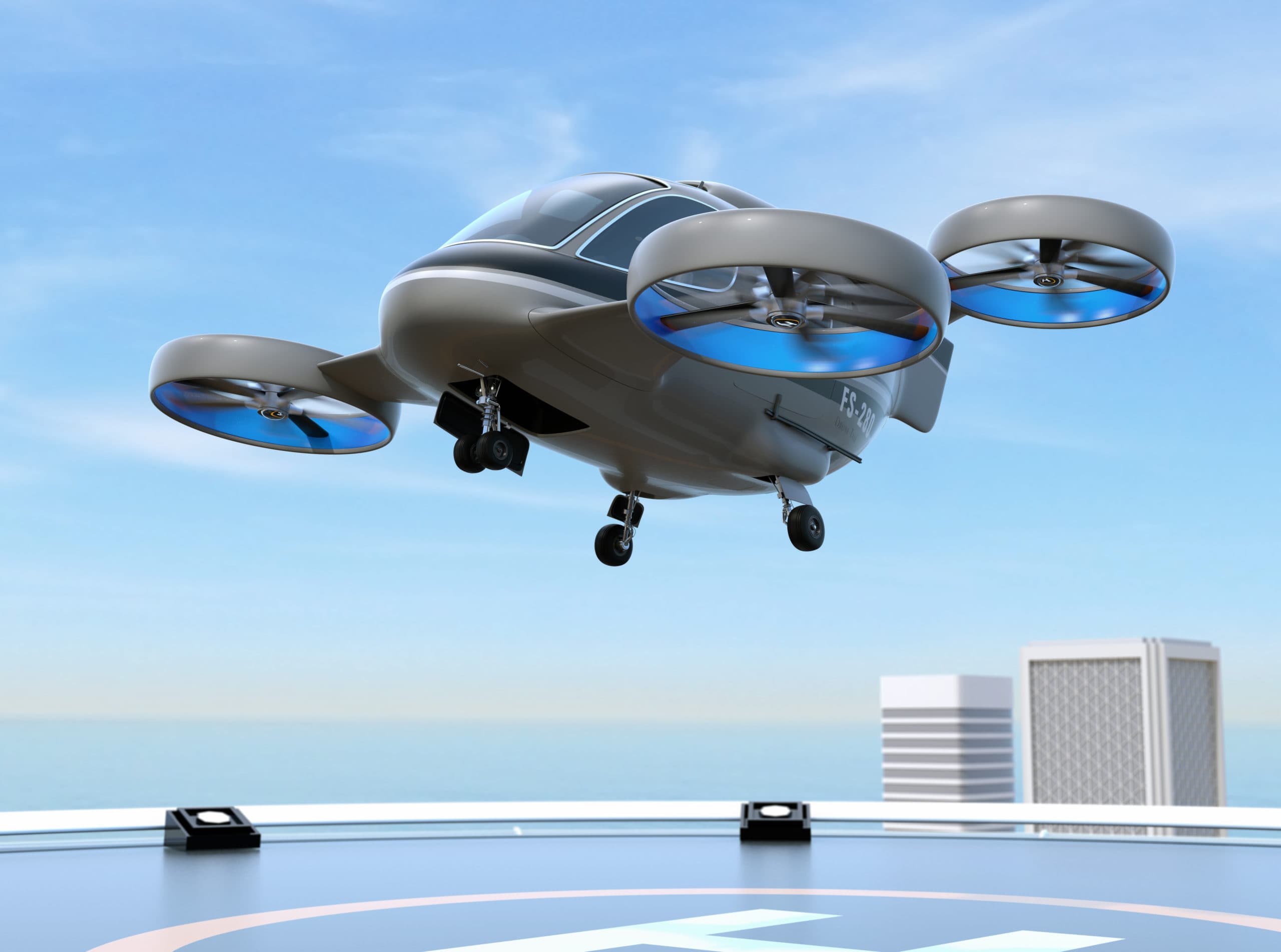 Metallic gray Passenger Drone Taxi takeoff from helipad on the roof of a skyscraper. 3D rendering image.