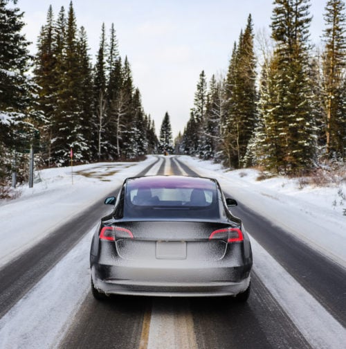 Electric car driving, mountains snow