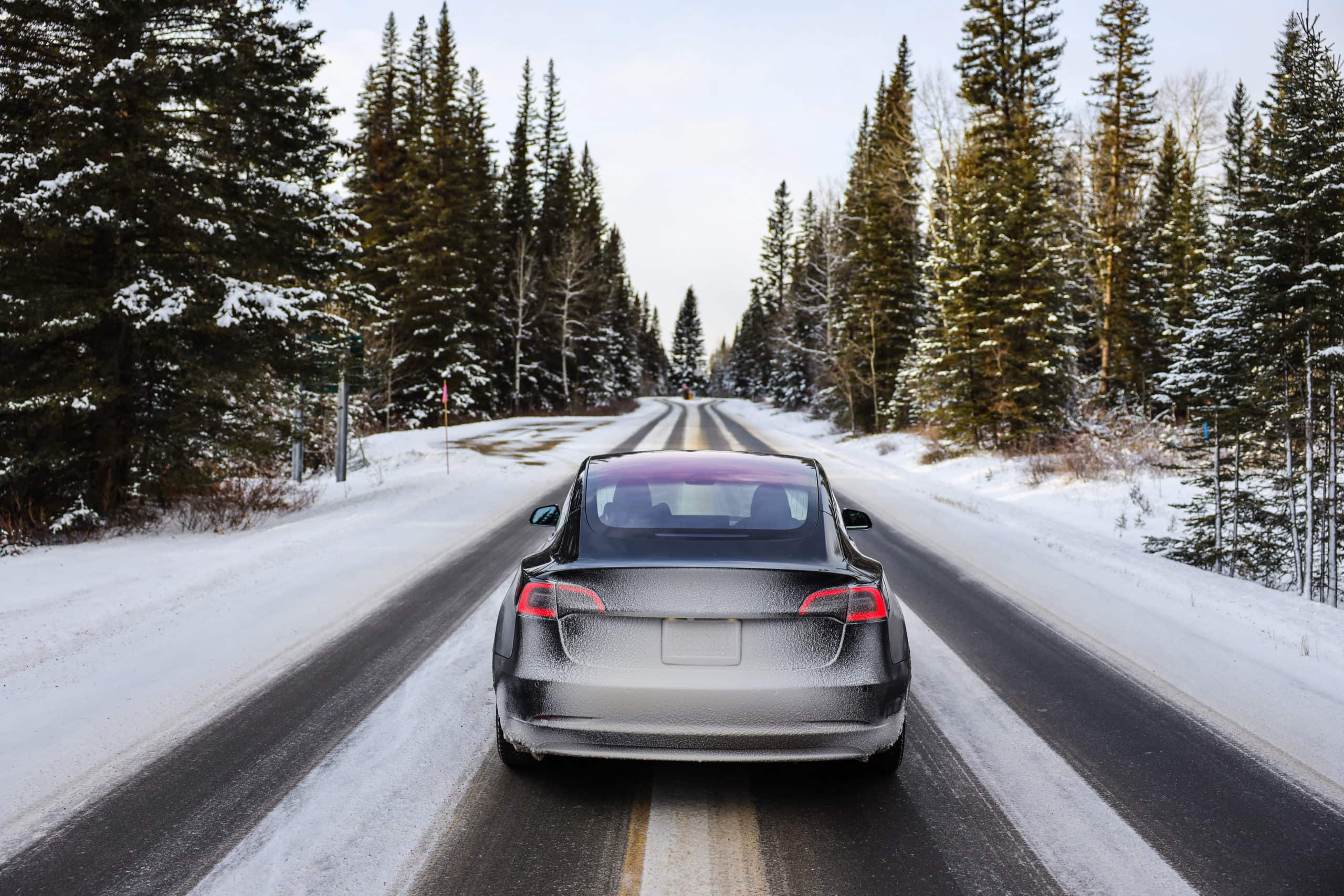 Electric car driving, mountains snow